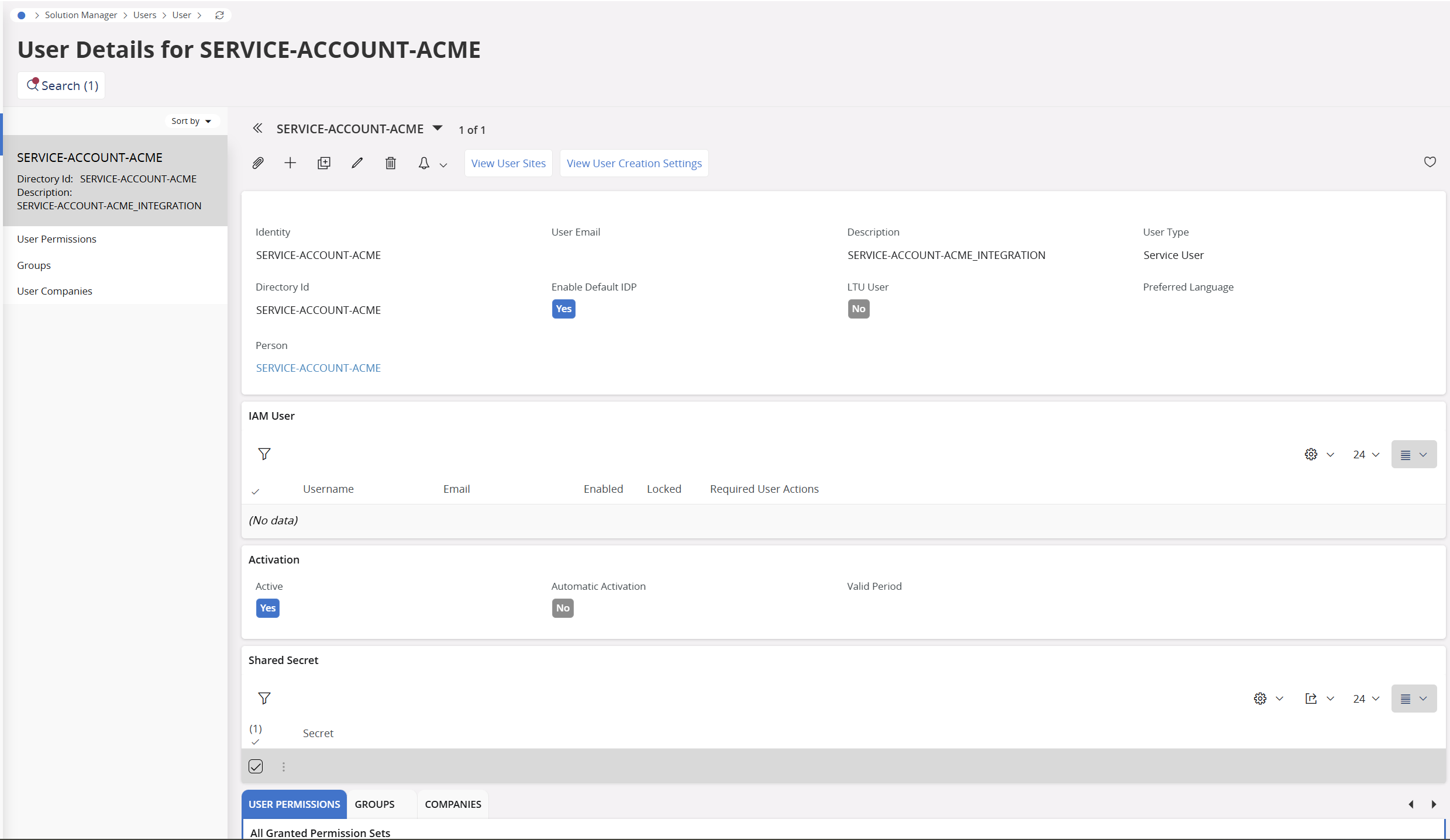 - Create an integration user (or reuse an existing service account) in Security > Users and make sure it is active for every company whose data you plan to read.