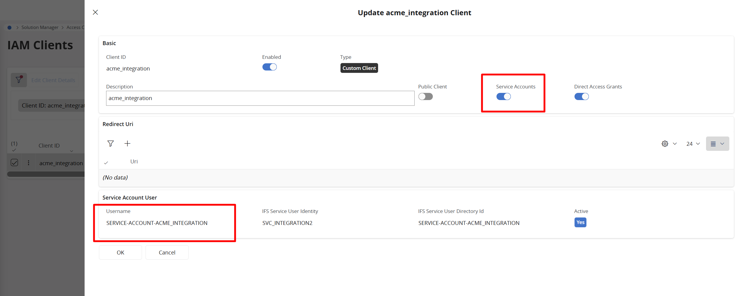 - First, create an IAM Client. Configure as on the pictures below. You need to create a Service User and connect to the IAM Client. From this configuration, use Client ID and Secret to configure access from Excel to your IFS Cloud instance.